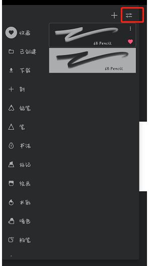 2.在画布上打开画笔库界面,选择一个你常用的画笔。上面的缩略图右下角有一个小爱图标。没有收藏就显示灰色,有就显示红色。
