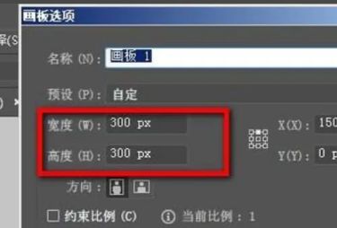 4、在弹出的“画板选项”对话框中,将“宽度”设置为300,“高度”设置为300,然后单击“确定”按钮,返回到绘图界面,可以看到画布大小正在缩小
