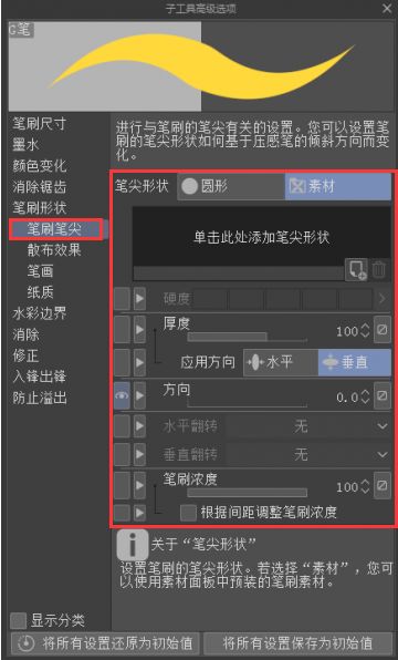 5、“硬度”、“厚度”、“方向”、“刷子浓度”等“刷子形状”相关选项出现在右侧。