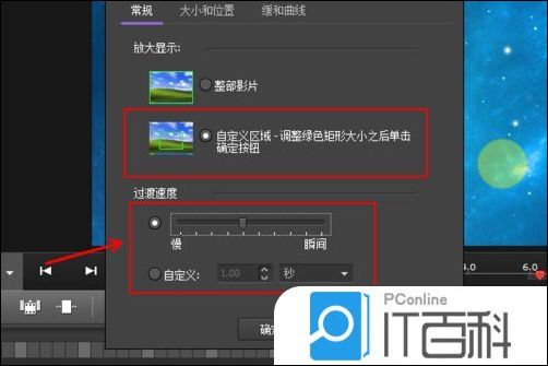 2、软件弹出缩放平移设置对话框,在放大显示里面选择自定义区域,大多数时候我们只是在一段视频的部分进行放大的操作,在过渡速度里面将速度放到中速或者是使用自定义的每秒速度
