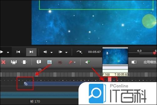 6、除了在效果里面点击添加缩放平移以外,还可以再预览窗口下面的三个叠加的方块,如图所示,直接开启添加缩放平移,然后设置,点击应用缩放平移即可,操作和前面差不多