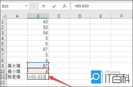 之后在极差值后面的单元格中输入=B9-B10,然后按回车键;