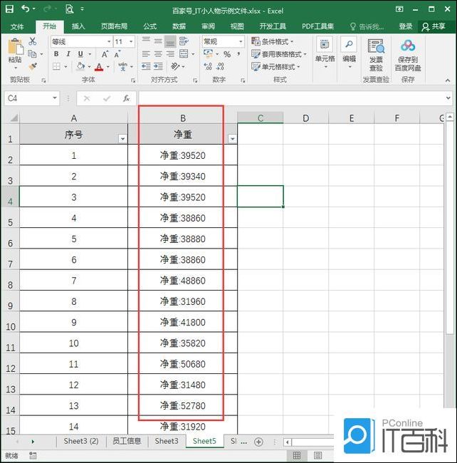 1、以下图中的表格为例,要给“净重”列的数字前统一加上一个文字“净重:”;