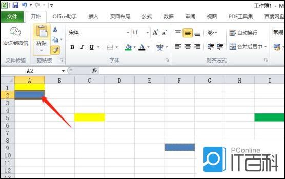 4.想要把单元格填充上颜色,就选中哪个单元格,在A1单元格上填充黄色,就点击A1单元格,单元格A1就被填充了黄色,如下图红色箭头指向所示: