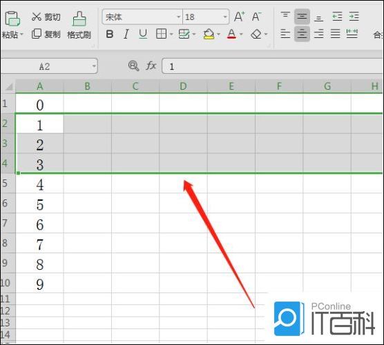 4、最后,按住鼠标左键往下拉,当光标上面提示数字出现“9”的时松开鼠标,这时在每0到9每一个数字的下面都出现了三个空白行。