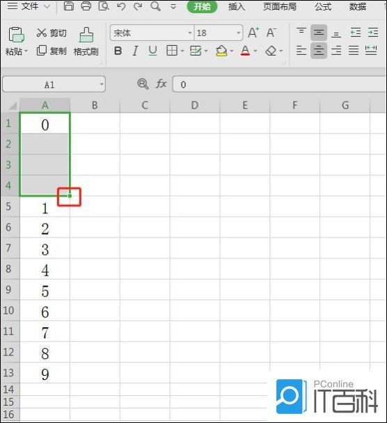 3、点完之后在“0”下面就出现了三个空白行,用鼠标将A1到A4单元格同时选定,然后把光标放在A4单元格的右下角,当光标变成黑色十字的时候,往下拉。