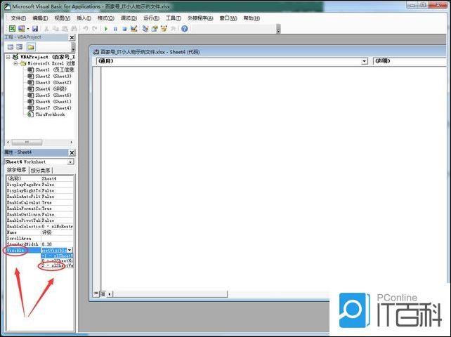 3、在打开的“VBA”编辑窗口中,左下侧中找到“Visible,选中“2”;
