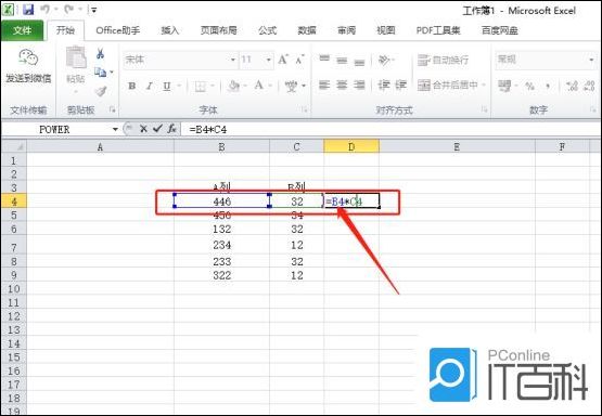 2.然后,在单元格中输入等号,选择第一个参数B4单元格,输入乘号,选择第二个参数C4单元格,按下键盘的【Enter】键,就可以求出来乘积了,如下图红色圈出部分所示: