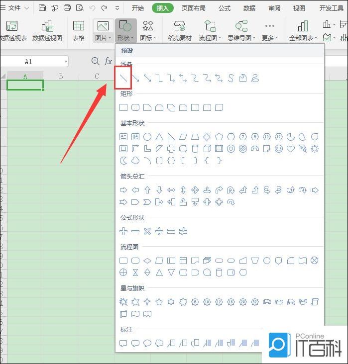 3、点击进去找到“ 形状 ”按钮,将“形状”按钮点击就会看到很多的 图形 图案,找到直线点击一下