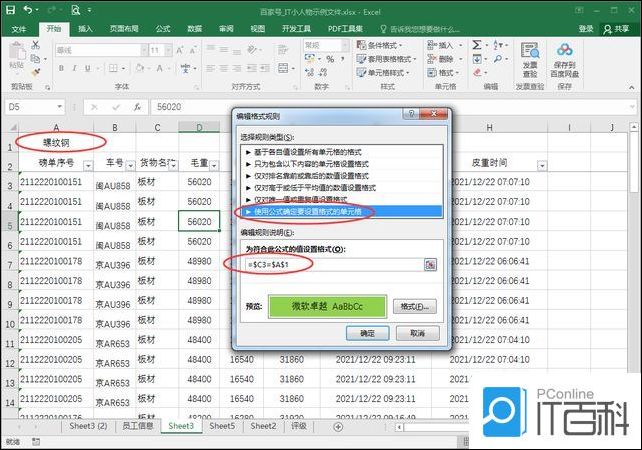 5、在“编辑格式规则”界面中,选择最后一条,然后输入公式“=$C3=$A$1”,选择填充的格式颜色,并确定;
