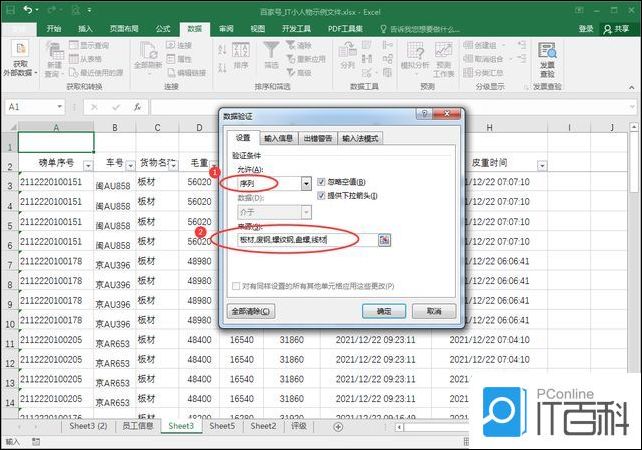 3、选择【序列】,在来源中输入选项名称“板材,废钢,螺纹钢,盘螺,线材”,下拉选项就做好了;