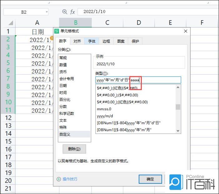 4、点击自定义,然后选择需要的时间格式,在后面加上【aaaa】,也可以加上【aaa】只显示星期后面的数字;