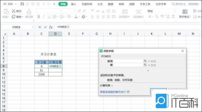 4.用鼠标左键单击计算结果的单元格,在这单元格中,输入函数Power后,会提示函数的参数,如下图所示。