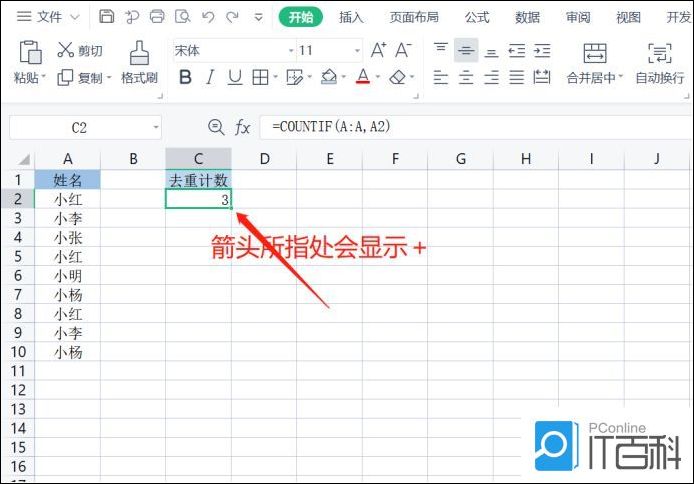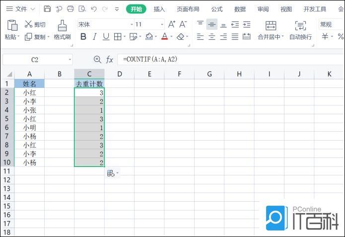 5.现在根据C列中的数值就知道A列每个姓名的重复个数。