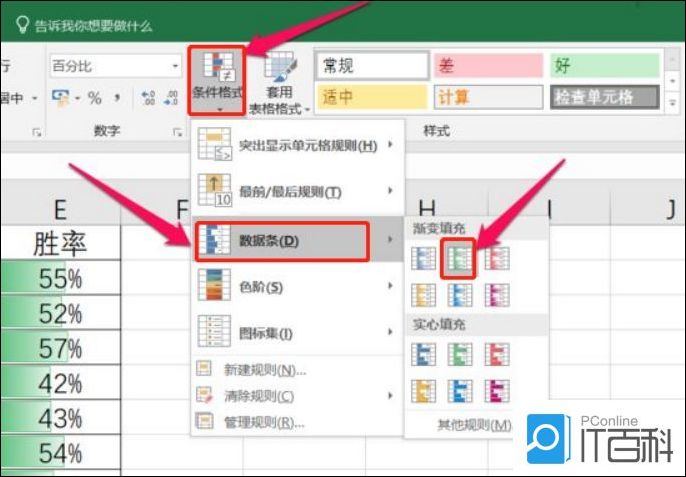 4.然后按照图中红色箭头指示位置点击条件格式,然后点击数据条,然后这里小编选择渐变填充中的绿色,如下图。