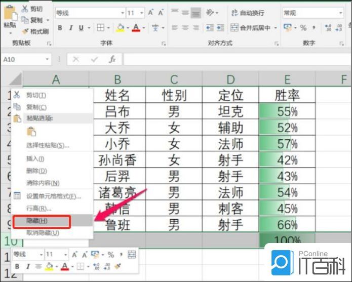 5.然后可以看到最后一列数据已经是数据可视化了,看起来直观明了,然后选中最后一行,然后点击右键弹出右键快捷菜单,点击隐藏将最后一个的参考数据进行隐藏,如下图。