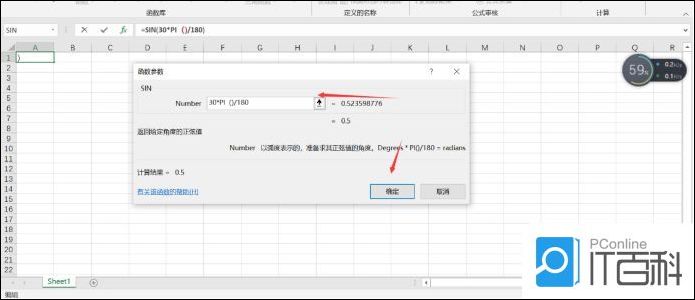3.点击“SIN”后,在弹出的“函数参数”对话框中输入数值,这里需要注意输入的格式为“度数*PI()/180”,直接输入度数是不正确的。