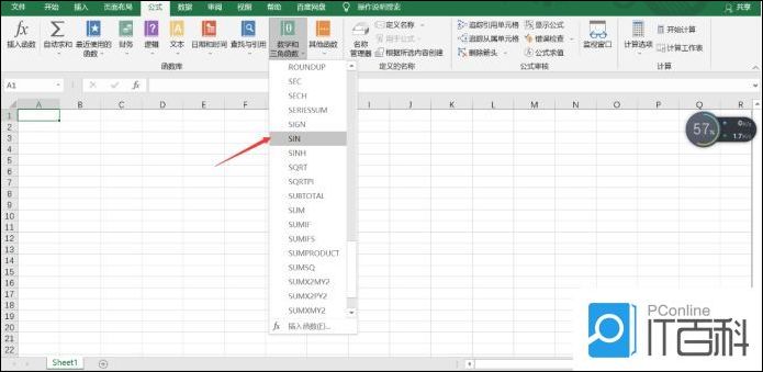 2.点击“数学与三角函数”,打开下拉框,鼠标拖动下拉方块或滑动鼠标找到正弦(SIN),并点击,如图所示。