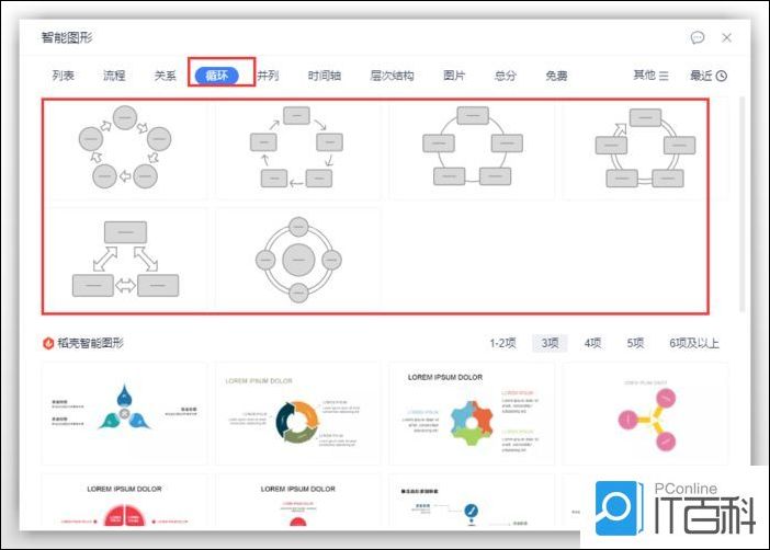 3、打开智能图形对话框,找到循环,选择你喜欢的循环样式