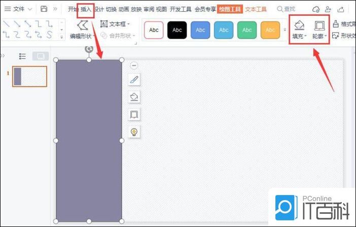 我们在PPT文档的左边[插入]一个矩形,然后将填充设置为紫色,轮廓设置为无,如图所示。