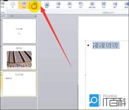 5、再创建一个新的幻灯片,输入标题,点击上方的“切换”,选择一个效果,为前面制作的幻灯片添加效果。