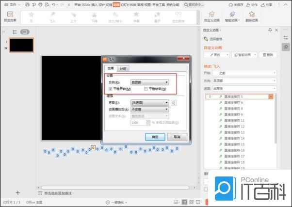 全选所有直线,移动到画布外,点击工具栏中的动画—飞入,在效果选项中设置为与上一动画同时,方向调整为自顶部。