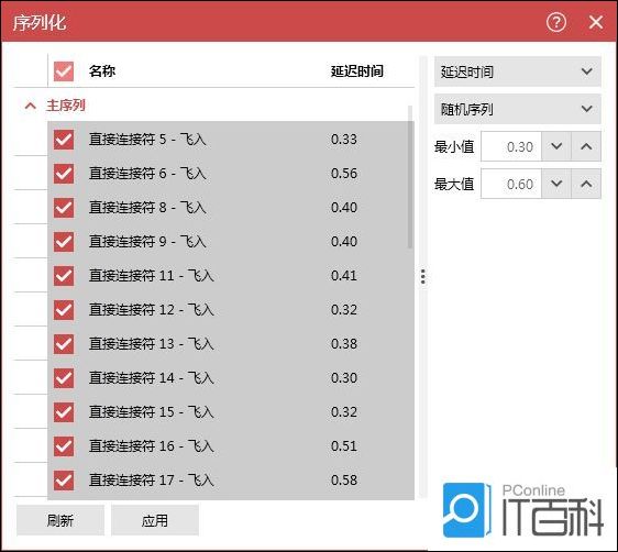 再次进入序列化,选择延迟时间—随机序列,将最小值设置为0.3,最大值设置为0.6,勾选名称后点击应用。