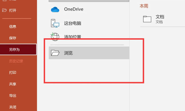 2、在左侧选择“ 另存为 ”,然后在右侧单击“ 浏览 ”。