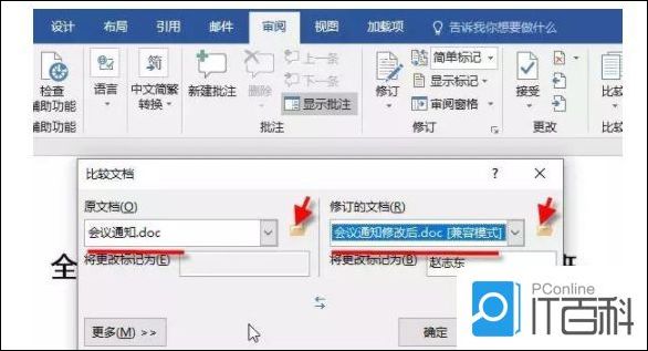 2.在打开的“比较文档”窗口中,分别选择原始文档和修订文档(单击黄色小文档图标找到文件)