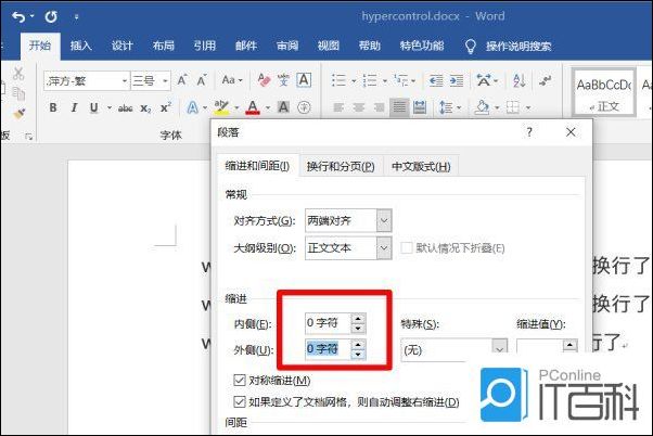 3.在弹出的“段落”对话框中,把“缩进”的两个值全部更改为“0字符”。