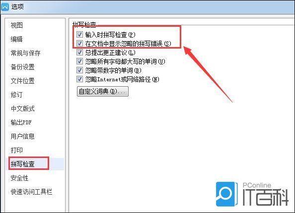 3.虽然打印后看不到,但也会有人觉得波浪线影响美观,但是想要去掉波浪线也很简单。只要关闭拼写检测功能就不会再显示出来了,具体设置在选项---拼写检测勾掉这个功能即可。