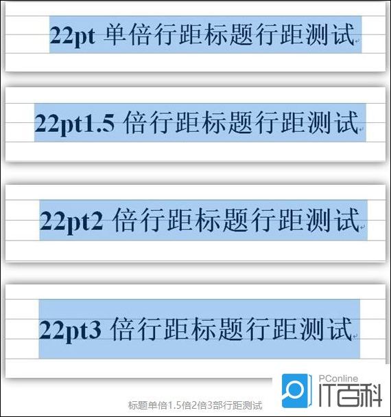 下面的图表中,用22磅(pt)的标题字号勾选了“如果文档网格已定义,则对齐该网格”.当设置为单倍、1.5倍和2倍行距时,标题占用的行格数总是2行;当设置为3倍行距时,标题占用的行格数是3行.也就是说,22pt的标题最小容纳宽度是2行,而倍数行距设置在2倍行距之下是无效的.因此,我们在设定行距时常常会遇到难以解释的问题.同时还展示了使用倍行距的一个优点:无论倍行距有多小,都可以保证文本或嵌入图片完全显示.