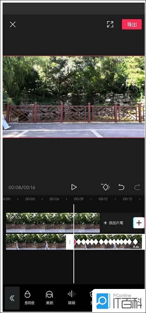 05拖曳画中画轨道使其与视频轨道左侧对齐,选中视频轨道,点击「变速J按钮。