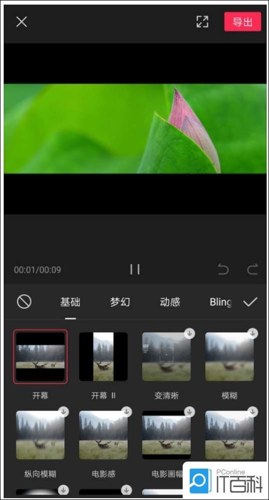 02进入特效编辑界面,在「基础」特效列表框中选择「开幕」特效,此时在上方预览窗口中可以查看视频的「开幕」特效。