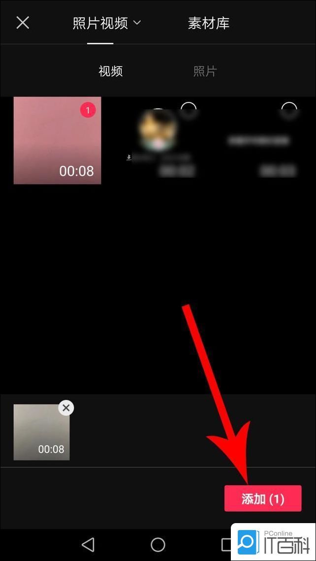 2、打开照片视频列表点选“视频素材”,然后点击“添加”。