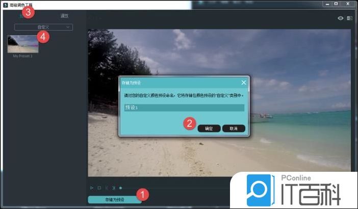 如果你想要将调节后的色彩效果保存为预设,请选择“储存为预设”,对自定义的预设进行命名,点击“确定”,则该效果将会储存在颜色预设的“自定义”类别中。