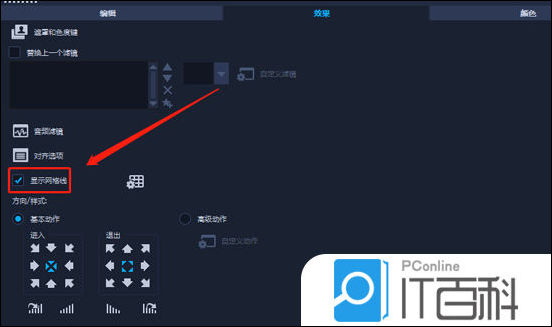 4、双击轨道1上视频素材,点击右侧上方的属性面板中—效果,勾选“显示网格线”。