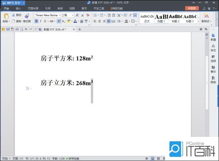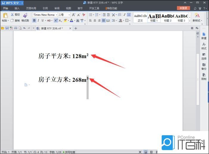步骤5:然后128平方米,268立方米的上标单位就设置出来了。效果如下: