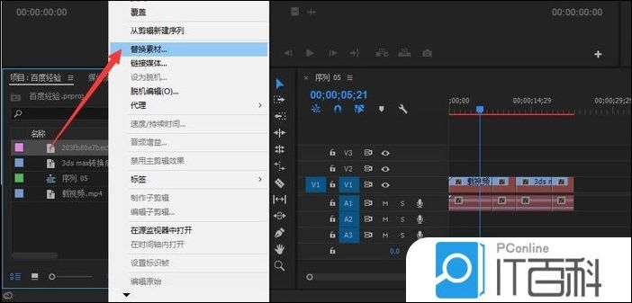 1、直接替换该脱机的视频。选中脱机素材,鼠标右键菜单中选择【 替换素材 】,如图所示