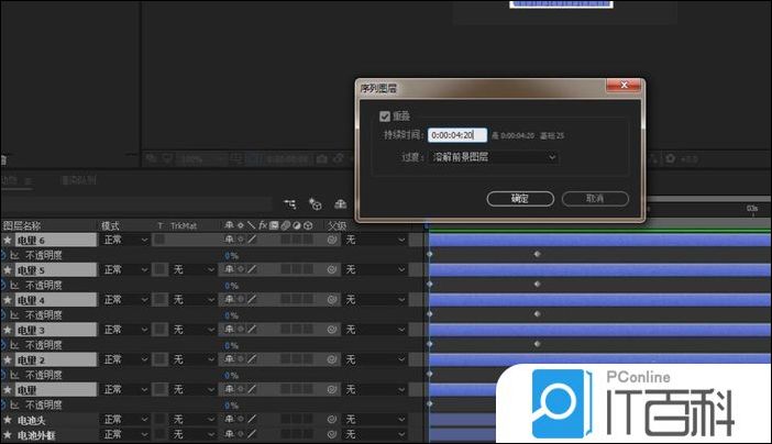 5、我们需要把这些电量在不同时间段的时候显示,所以选中所有电量, 注意选择的时间要至下而上哦 。然后右击关键帧复制选择系列图层, 设置间隔时间。