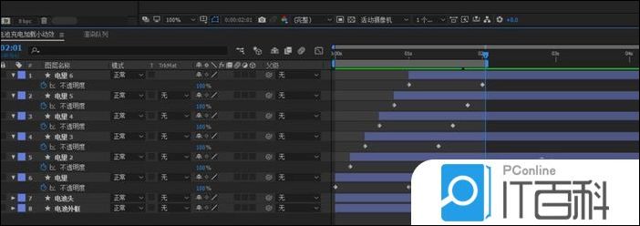 4、选中所有电量图层,按下T键打开 不透明度属 性,在第 0s出k关键帧 ,起始值为0 ,第二帧1s处设置不透明度为100.
