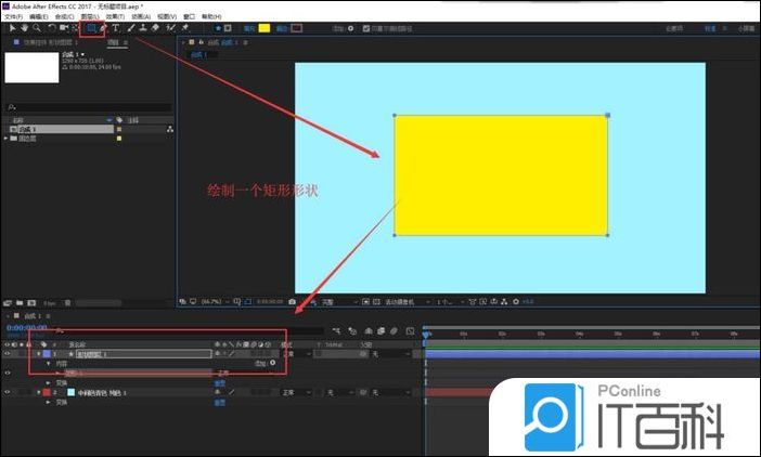 3、鼠标在合成1的图层空白处单击一下,然后选择 矩形工具 ,在合成1的预览窗口中绘制一个差不多的矩形图形出来。