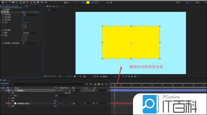 6、设置完成之后,可以播放 时间轴预览查看After Effects动画效果 ,我们可以看到我们设置固定的那一个边就不会产生波形变形效果了。