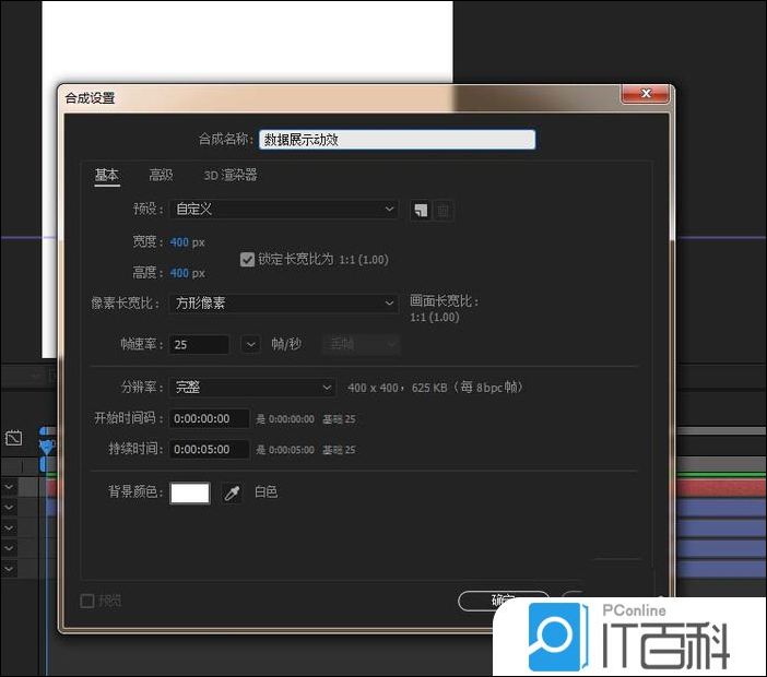 1、打开AE软件,命名数据展示动效,调整相应的参数。