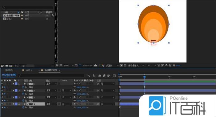 3、选中椭圆图层,按下 s键 调用出缩放属性,开始为不显示,下一帧为完全显示,选中所有 关键帧 ,按下 F9 ,添加缓动这样效果比较缓和自然。