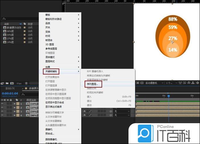 6、然后将一个文字对一个的椭圆图层 ctrl+shift+c 预合成,至上而下的选择四个预合成,右击选择关键帧辅助-系列图层,设置间隔时间,让四个图层错开显示。