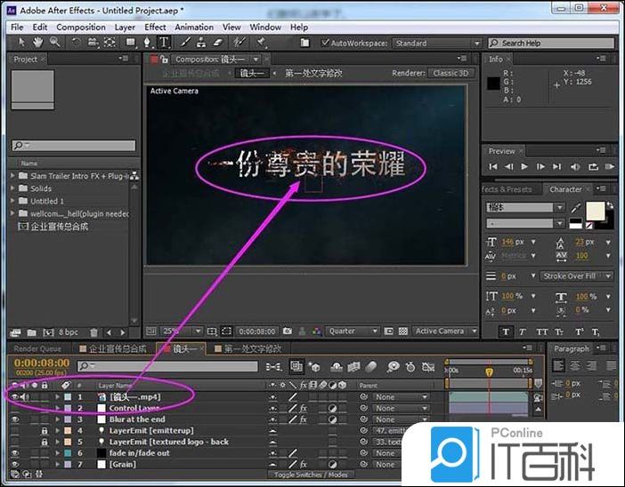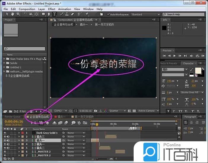 7、其它文字的修改方法与上面相同,修改完所有需要修改的内容后,回到主合层,然后渲染输出。