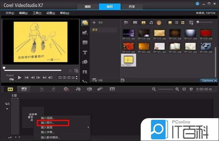 6、接着回到软件界面的故事版视图,在添加图片视频的方框那里右击鼠标,然后就会弹出 插入的选项 ,这里选择插入照片或是视频,也可以选择素材的栏的图片,直接选中要 添加的照片 ,然后拖动好下面的编辑窗口即可。