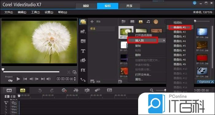 4、接下来就要这9个覆叠轨里添加素材了,当然视频和图片都是可以的,这里先添加一些图片做为例子,点击 素材库里的图片 ,右击选择 插入到 ,然后选择要插入的覆叠轨编号, 每个覆叠轨里插入一张图片 ,总共插入9张图片。