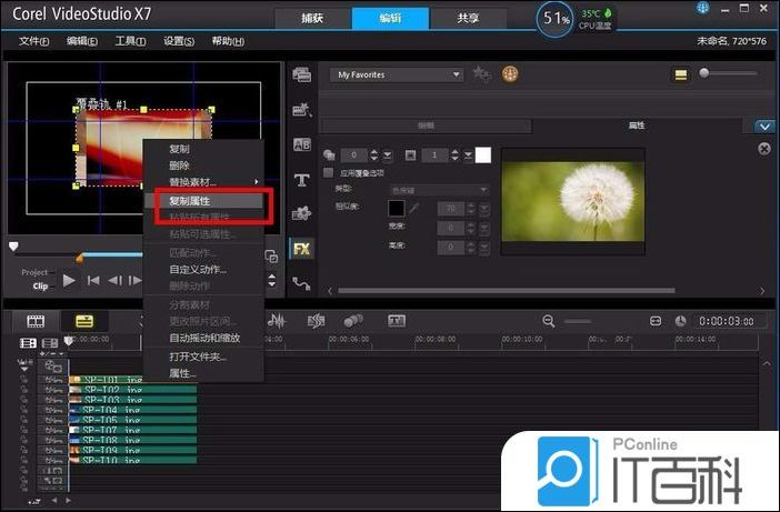 9、设置好之后,右击覆叠轨1的素材,在右键菜单中选择 复制属性 ,然后选中剩余的 8个覆叠轨素材 ,同样右击鼠标,在右键菜单中选择粘贴所有属性,这样9个素材就都加上了一样的边框。